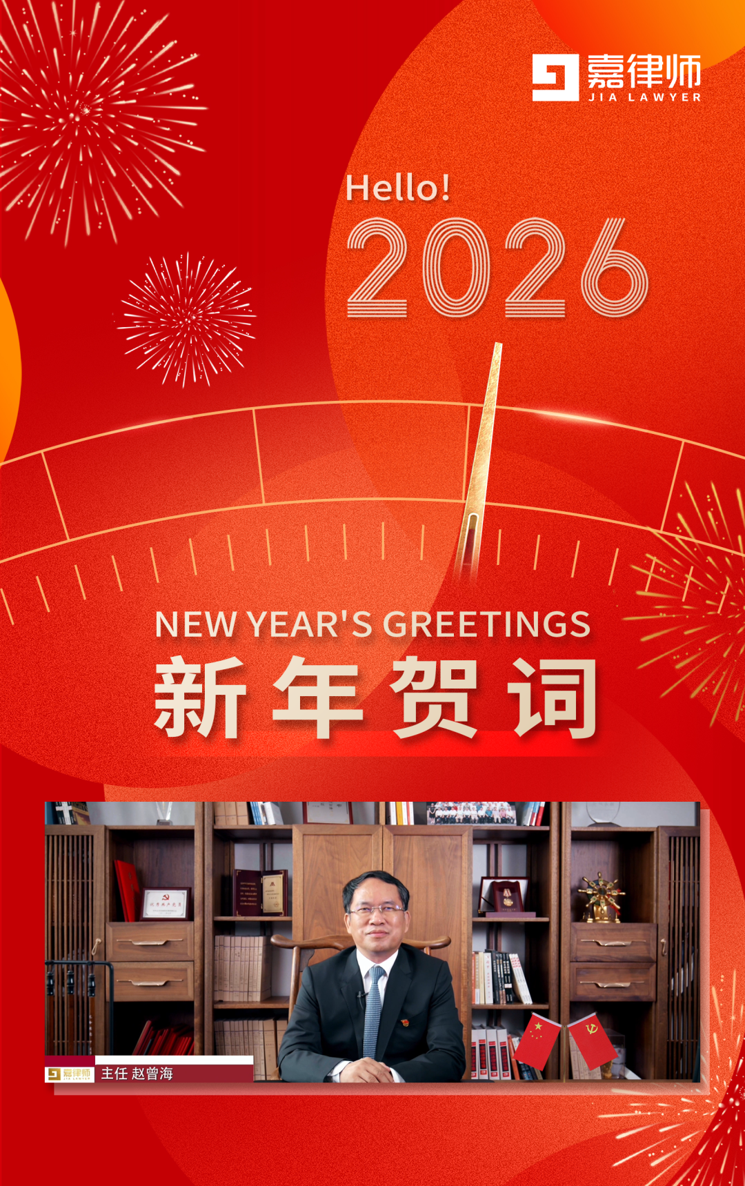 最后,衷心祝愿祖国繁荣昌盛、国泰民安,人民幸福安康、生活美满,世界和平安宁、共同发展!祝福全体嘉律师新春新禧新气象、新年新胜新高峰!